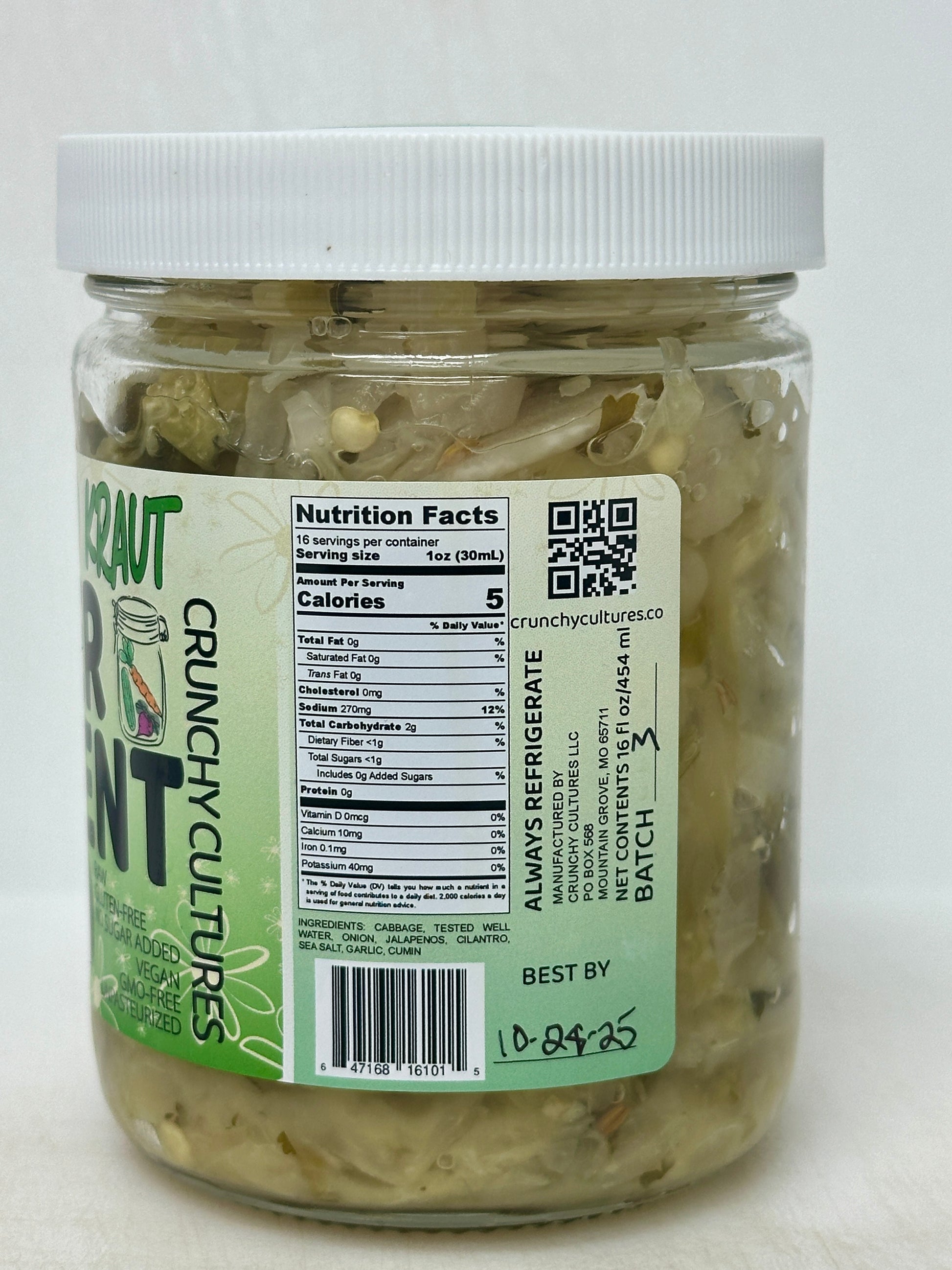 Our Taco Kraut is a bold, naturally fermented sauerkraut with just the right kick. The combination of cilantro, cumin, onions, and garlic gives this ferment a zesty, taco-inspired flavor that’ll have you hiding it in the back of the fridge to keep it all for yourself!